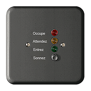 Türstation für Rufleuchte • Mit Taster und Summer • Anzeige mittels roter, gelber, grüner LED • Mit Schraubklemmen • Beschriftung französisch • Einbautiefe 20 mm • POMI • schwarz • IP20 • 86 x 86 mm