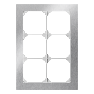Telaio di copertura EDIZIO.liv prestige • Con 6 ritagli unitari EDIZIO.liv • Montaggio verticale • Sistema de fissagio SNAPFIX® • Fondo isolante bianco • acciaio cromato smerigliato • 214 x 154 mm