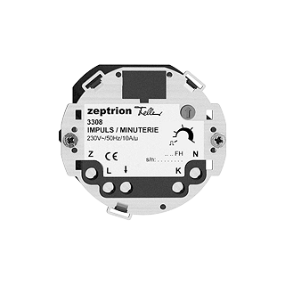 Mécanisme impulsion/minuterie zeptrion • Station principale • Pour poussoir zeptrion, zeptrion IR, série 3308 • 1 contact de commutation • Profondeur 23 mm • BSE • incolore • IP20 • Distance de fixation 52 mm • 10 A, 230 V AC • Pour lampes LED 200 VA / lampes à incandescence et halogènes HT 2300 W/ lampes halogènes BT avec transfo conventionnel 1500 VA / lampes halogènes BT avec transfo électronique 600 VA / ballasts électroniques EVG 600 W / lampe à économie d'énergie 600 W • Stations secondaires 3328
