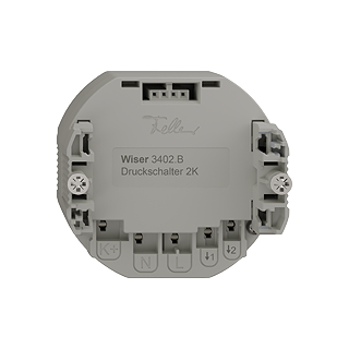 Unité fonctionnelle interrupteur à poussoir Wiser 2 canaux • 2 contacts de commutation, 10 A chacun, max. 16 A par appareil, 230 V AC • Fonctionnel avec commande Wiser • Pour source lumineuse LED 200 VA / lampes halogènes BT avec transfo conventionnel 1500 VA / lampes halogènes BT avec transfo électronique 600 VA / ballasts électroniques BE 600 VA / lampe à économie d'énergie 600 VA / charge ohmique 2300 W • Avec bornes enfichables • Profondeur 36 mm • BSE • IP20