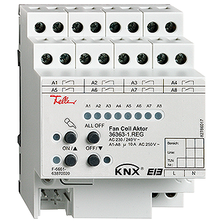 Actionneur FanCoil • Tension de commutation 230 V AC • Pouvoir de coupure AC1 10 A, AC3 10 A • Courant d'enclenchement max. 800 A 200 μs, 165 A 20 ms • Courant de commutation min. 100 mA • Avec commande manuelle • Avec bornes à vis • AMD • IP20 • 4 UM • 230 V AC, 50 Hz