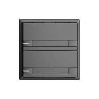 EDIZIOdue colore • Poussoir UNI • 12-48 V DC / 12-36 V AC • Courant de commutation min. 1 mA, max. 50mA • Max. 14 L • Avec bornes à vis • Avec LED bleu • Avec étiquette en papier • Touche double • Commande à 2 touches • Profondeur 17 mm • F • gris foncé • IP20 • 60 x 60 mm • Commande à 2 touches