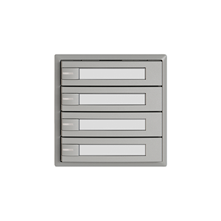 EDIZIO.liv • UNI-Taster • 12-48 V DC / 12-36 V AC • Schaltstrom min 1 mA, max. 50 mA • Max. 14 L • Mit Schraubklemmen • Ohne LED • Mit Papiereinlage • Vierfach-Taste • 1-Tastenbedienung • SNAPFIX® Befestigungssystem • Einbautiefe 17 mm • G.A • hellgrau • IP20 • 60 x 60 mm
