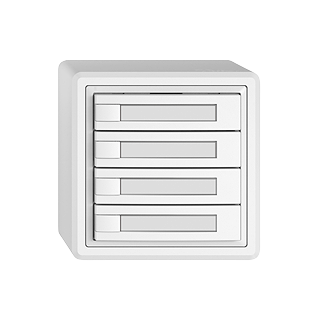 EDIZIO.liv • Poussoir UNI • 12-48 V DC / 12-36 V AC • Courant de commutation min. 1 mA, max. 50mA • Max. 14 L • Avec bornes à vis • Sans LED • Avec étiquette en papier • Touche quadruple • Commande à 1 touche • Système de fixation SNAPFIX® • Hauteur 59 mm • GX.54.A • blanc • IP20 • 74 x 74 mm