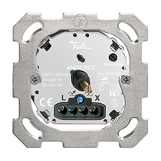 Variateur universel rotatif • Lumineux • 230 V AC, 50 Hz • Pour lampes à incandescence et lampes halogènes BT • Pour transformateurs conventionnels et électroniques • Mode de charge mixte de transformateurs électroniques et conventionnels n’est pas possible • Luminosité minimale et maximale réglable • Avec contact de commutation pour contact inverseur • 20-420 W ohmique, 20-420 VA, inductif/capacitif • Avec LED bleu 1,0 mA • Profondeur 29 mm • BSM • incolore • IP20 • 77 x 77 mm
