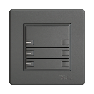 EDIZIO.liv • KNX-Taster RGB • 21-30 V DC SELV • Grundbedarf max. 250 mW • KNX-Busanschlussklemme • Inklusive KNX Secure Busankoppler • Besteht aus Funktionseinsatz mit bis zu acht möglichen Tastenbelegungen • Mit Temperaturfühler • SNAPFIX® Befestigungssystem • Ohne LED • Dreifach-Taste • 2-Tastenbedienung • Einbautiefe 22 mm • GMI.A • dunkelgrau • IP20 • 96 x 96 mm (93 x 93 mm)