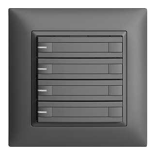 EDIZIOdue colore • Pulsante KNX RGB • Compatibile con KNX Secure • 21-30 V DC SELV • Fabbisogno di base mass. 250 mW • Morsetto di collegamento bus KNX • Con accoppiatore bus KNX Secure • Consiste in unità funzionale con fino a otto possibili assegnazioni di tasti • Con sensore temperatura • Con RGB LED rosso, verde, blu, bianco, giallo, vialo e 2 colori liberamente definibili dall'utente • Potenza supplementare per ogni LED mass. 10 mW • Con targhetta • Tasto quadruplo • Comando a 2 tasti • Profondità 22 mm • FMI • grigio scuro • IP20 • 88 x 88 mm