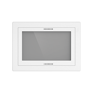 EDIZIO.liv • Panel KNX 7" • Indication et unité de commande • KNX Data Secure • Raccordements arrière: 1x KNX, 2x USB, 1x Ethernet, 4x I/O • Le Panel KNX est paramétré à l'aide du ConfigTool et programmé avec l'ETS • Paramétrable avec ou sans répartition par pièce • Pour fonctions: commutation, variation, variation avec valeur de couleur RGB, stores, volets roulants, scènes, valeur*, guidage forcé*, thermostat d'ambiance, état (fenêtres, portes, mouvement etc.), interrupteur horaire avec fonction astro, simulation de présence*, touche intelligente* • Utilisateurs différents avec différents droits d'accès • Support de max. 1000 objets de communication • Configuration avec ETS5.7 ou supérieur • Alimentation en tension externe 12-32 V DC ou bien: Power-over-Ethernet • Puissance absorbée: < 9 W • Convient pour boîte AGRO 9926.90 (E-No. 372 117 129) • Montage en paysage ou en portrait • Ne doit pas être installé horizontalement • GMI.A • blanc • IP20 • 156 x 216 mm (213 x 153 mm)