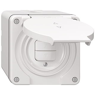 Contact pour stores 1 canal • 10 A, 250 V AC • Avec 2 touches • Avec bornes enfichables • Disque frontale 53 mm, pour découpe 53 mm • Temps d'inversion minimum (MONT/DESC) <500 ms possible • Hauteur 71 mm • NAP.Q • blanc • IP55 • 87 x 87 mm