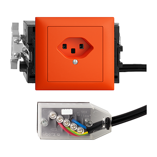 Prise simple type 23 • 16 A, 250 V AC, L + N + PE • Avec bornes à vis • Raccordement sur L1 • Avec boîte d'encastrement • Avec fixation SNAP pour rail-DIN 35 mm • Hauteur de montage 53 mm • FKE53.SN • orange • IP20 • 80 x 130 mm • Avec adaptateur Technofil