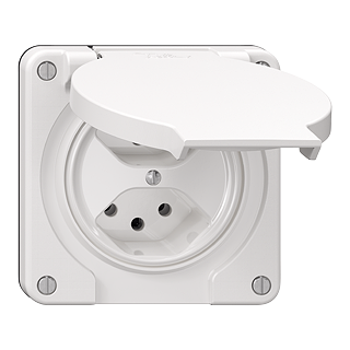 Prise double type 13 • 10 A, 250 V AC, L + N + PE • Avec bornes enfichables • Disque frontale 60 mm, pour découpe 60 mm • Parallèle • Profondeur 32 mm • N.CO.Q • blanc • IP21 • 87 x 87 mm