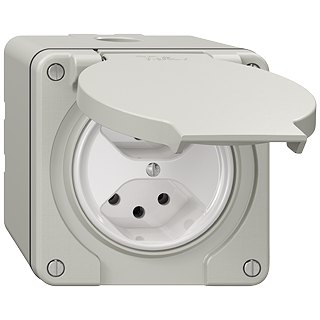 Prise double type 13 • IP21 • 10 A, 250 V AC, L + N + PE • Avec bornes enfichables • Disque frontale 60 mm, pour découpe 60 mm • Parallèle • N.CO.Q • gris clair