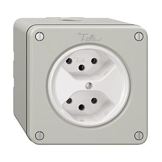 Prise double type 13 • 10 A, 250 V AC, L + N + PE • Avec bornes enfichables • Disque frontale 60 mm, pour découpe 60 mm • Parallèle • NU.CO.Q • gris clair