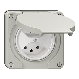 Prise double type 13 • IP21 • 10 A, 250 V AC, L + N + PE • Avec bornes enfichables • Disque frontale 60 mm, pour découpe 60 mm • Parallèle • N.CO.Q • gris clair