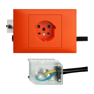 Prises type 25 • 16 A, 250 V AC, L + N + PE • 16 A, 440 V AC, 3 L + N + PE • Avec bornes à vis • Raccordement sur L1, L2, L3 • FMTE • Avec adaptateur Ecobus power • orange