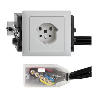 Prese tipo 25 • 16 A, 250 V AC, L + N + PE • 16 A, 440 V AC, 3 L + N + PE • Con morsetti a innesto • Raccordo su L1, L2, L3 • Con scatola ad incasso • Con bloccaggio rotativo • Altezza di montaggio 53 mm • FKE53 • grigio chiaro • IP20 • 80 x 86 mm • Con adattatore per cavo Technofil