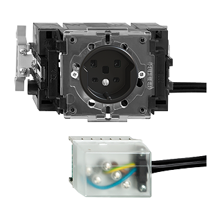 Prises type 25 • 16 A, 250 V AC, L + N + PE • 16 A, 440 V AC, 3 L + N + PE • Raccordement sur L1, L2, L3 • Avec boîte d'encastrement • Hauteur de montage 53 mm • JK53.SN • noir • IP20 • 70 x 130 mm • Avec adaptateur Ecobus power • Avec Cable Outlet 5-pol • Avec fixation SNAP pour rail-DIN 35 mm