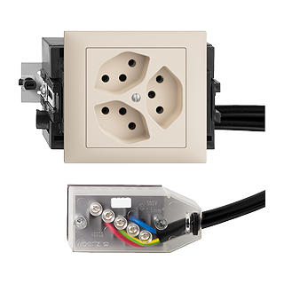Presa tripla tipo 13 • 10 A, 250 V AC, L + N + PE • Raccordo su L3 • Con scatola ad incasso • Con bloccaggio rotativo • Altezza di montaggio 53 mm • FKE53 • crema • IP20 • 80 x 130 mm • Con adattatore per cavo Technofil • Parallela