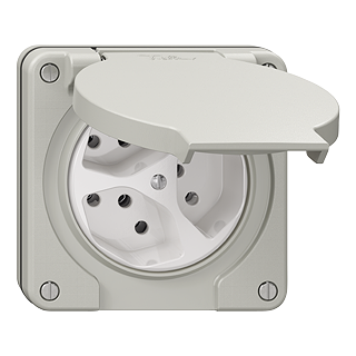 Dreifach-Steckdose Typ 13 • IP21 • 10 A, 250 V AC, L + N + PE • Mit Steckklemmen • Frontscheibe 60 mm, für Bohrung 60 mm • 3 Dosen getrennt • N.CO.Q • lichtgrau