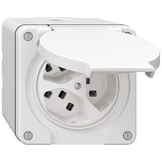 Dreifach-Steckdose Typ 23 • 16 A, 250 V AC, L + N + PE • Mit Steckklemmen • Frontscheibe 60 mm, für Bohrung 58 mm • Parallel • weiss