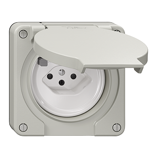 Prise de protection à courant de défaut type 13 • 10 A, 250 V AC, L + N + PE • Courant de déclenchement 30 mA • Avec bornes de connexion pour prises supplémentaires • Disque frontale 60 mm, pour découpe 60 mm • Profondeur 31 mm • N.CO.Q • gris clair • IP21 • 87 x 87 mm