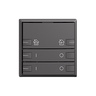ON/OFF 2-Kanal • Abdeckset zeptrionAIR • Die oberen Smart-Tasten ermöglichen die Bedienung von zeptrionAIR Zeitschaltuhren per WLAN • Untere Tasten für ON/OFF 2-Kanal • Das zeptrionAIR Abdeckset wird auf das zeptrion WLAN-Zwischenmodul 2K (3340-2-B.ZEP) und zeptrion ON/OFF 2-Kanal Funktionseinsatz 3302 oder Zentral-/Nebenstelle Funktionseinsatz 3320 montiert • Mit RGB-LED • Dreifach-Taste • 2fach-Bedienung • zeptrionAIR Zeitschaltuhr auf 2 Smart-Tasten • F • dunkelgrau • IP20 • 60 x 60 mm