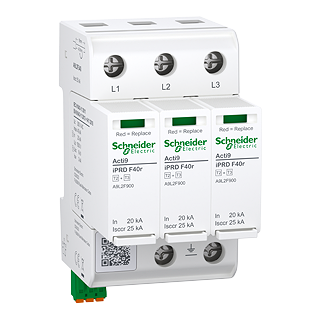 Acti9 modularer Überspannungsableiter iPRD F40r Typ 2+3 • Integrierte Sicherung im Gerät, keine Ableitervorsicherung notwendig (vorsicherungsfrei) • Fernmeldekontakt • Optische Funktions - / Defektanzeige des Ableiters und der integrierten Sicherung (grün OK/ rot Gerät defekt) • Geeignet für TN-C Netze • U0-Nennspannung 240 V AC (50/60 Hz) • Uc -höchste Dauerspannung 300 VAC • In-Nennableitstossstrom 20 kA. Imax -maximaler Ableitstossstrom 65 kA • Uoc-Leerlaufspannung 6 kV • Up-Schutzpegel 1,5 kV • DIN-Hutschienenmontage • Betriebstemperatur -40 bis +85 °C • Entspricht IEC 61643-11:2011, EN 61643-11:2012+A11:2018 • IP20 • 3P